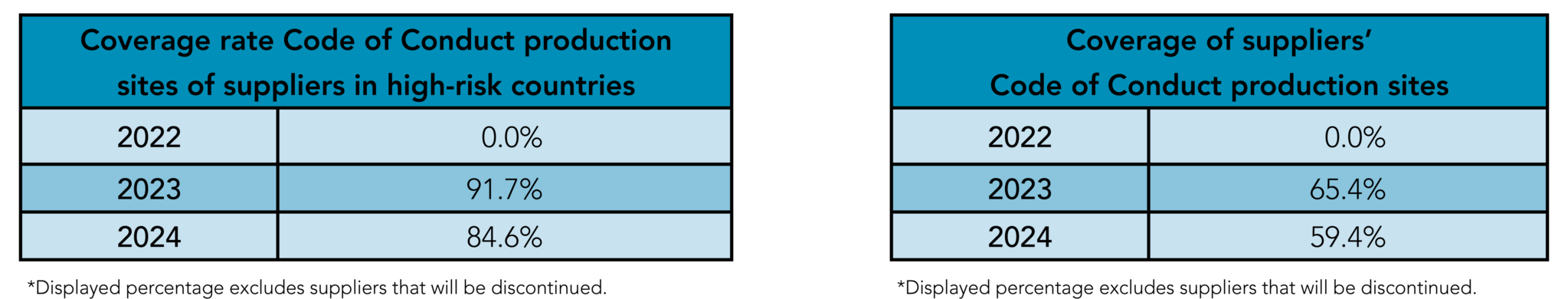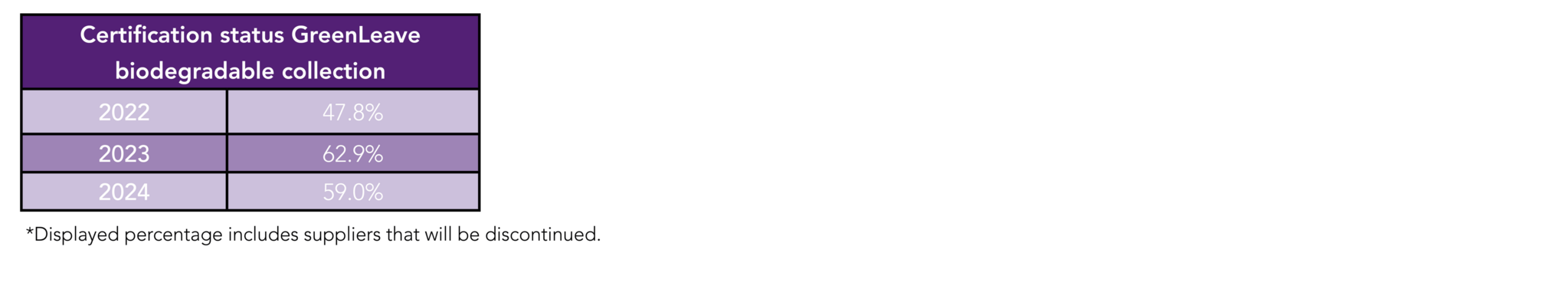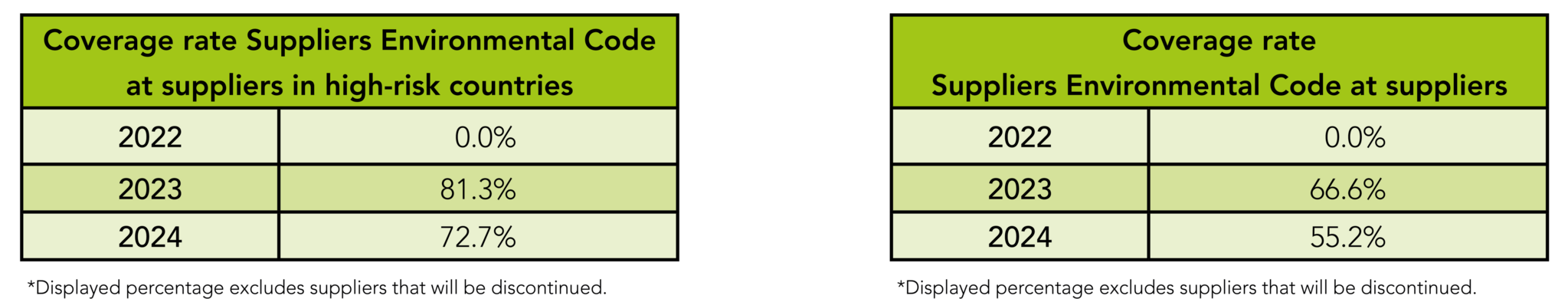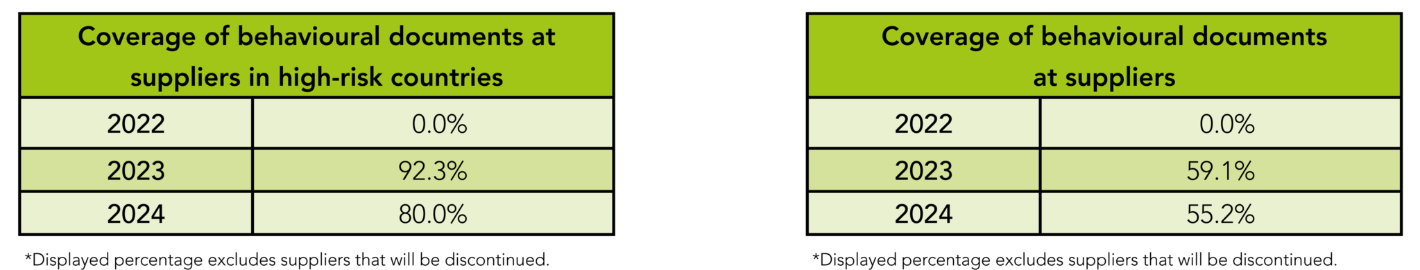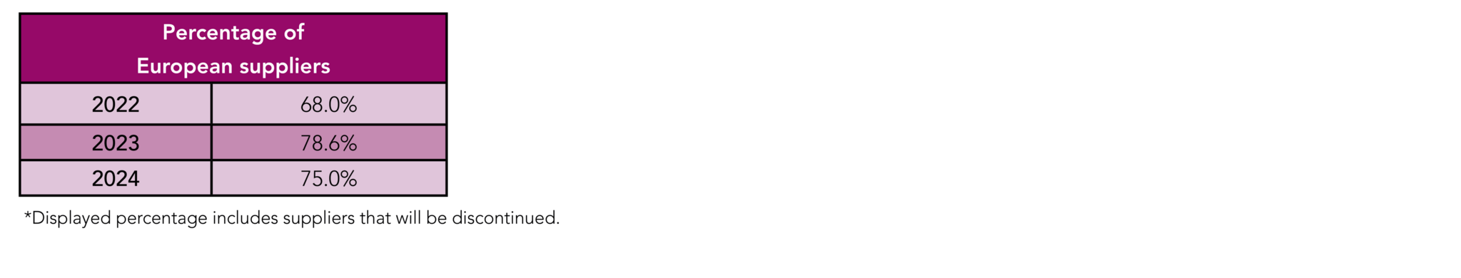 In 2024, Global Products Group made strides in obtaining signed Suppliers Environmental Code (SEC) behavioural documents within the supplier network. Although our goal was to have 100% of our suppliers sign, the percentage came out at 55.2%. This outcome calls for nuance: at the product level, 71.8% of the products in the basic collection come from suppliers who did sign the document. Moreover, more than half (61.5%) of the suppliers without a signature are located in the Netherlands, which has a low-risk profile in terms of Environment & Public Health. The partial coverage can largely be explained by the scaling up of our due diligence, which includes suppliers of sub-products that were previously out of scope. For the year 2025, we intend to structurally secure the SEC document for all suppliers, both existing and new, so that compliance with our standards and values is better guaranteed across the entire chain. |