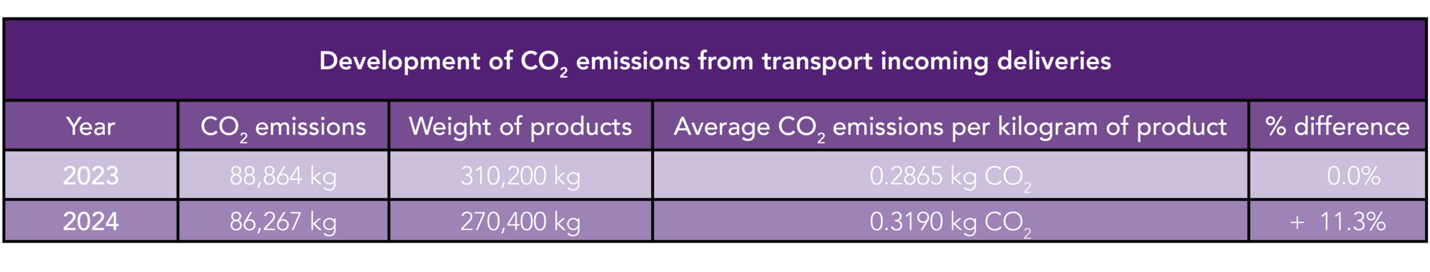 The goal of reducing CO₂ emissions from inbound deliveries by 25% proportionally compared to 2023 proved unachievable in 2024. Despite a solid foundation, including a comprehensive CO₂ dashboard with insight into transport routes, transport types and emissions per supplier, we were unable to achieve this reduction target. Looking only at the CO₂ emissions caused by upstream transport, the Global Products Group was able to achieve a 2.9% reduction in 2024. However, this is only part of the story, as the number of kilogrammes of products transported also decreased. Thus, the emissions per kilo did not reduce, but increased instead. |