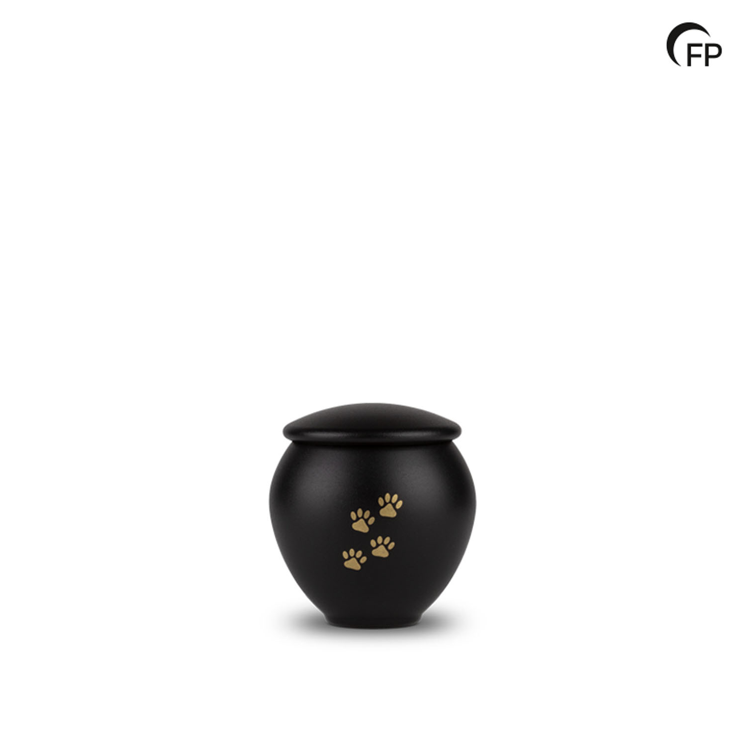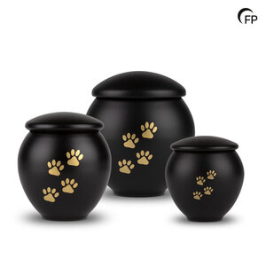 This small metal pet urn in 'eternal black' is an elegant and respectful memento to a beloved pet. The gold-coloured legs add a refined, stylish touch. This urn is also available in several colours and two larger sizes.