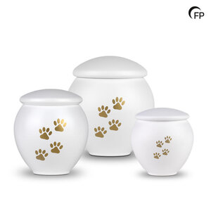 This small metal pet urn in 'serenity white' is an elegant and respectful memento to a beloved pet. The gold-coloured legs add a refined, stylish touch. The urn is also available in several colours and two larger sizes.