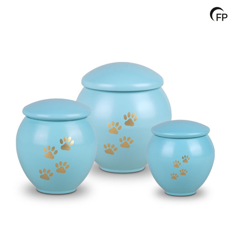This turquoise (tiffany grace) small metal pet urn is an elegant and respectful memento for a beloved pet. The gold-coloured legs add a refined, stylish touch. This urn is also available in several colours and in two larger sizes.