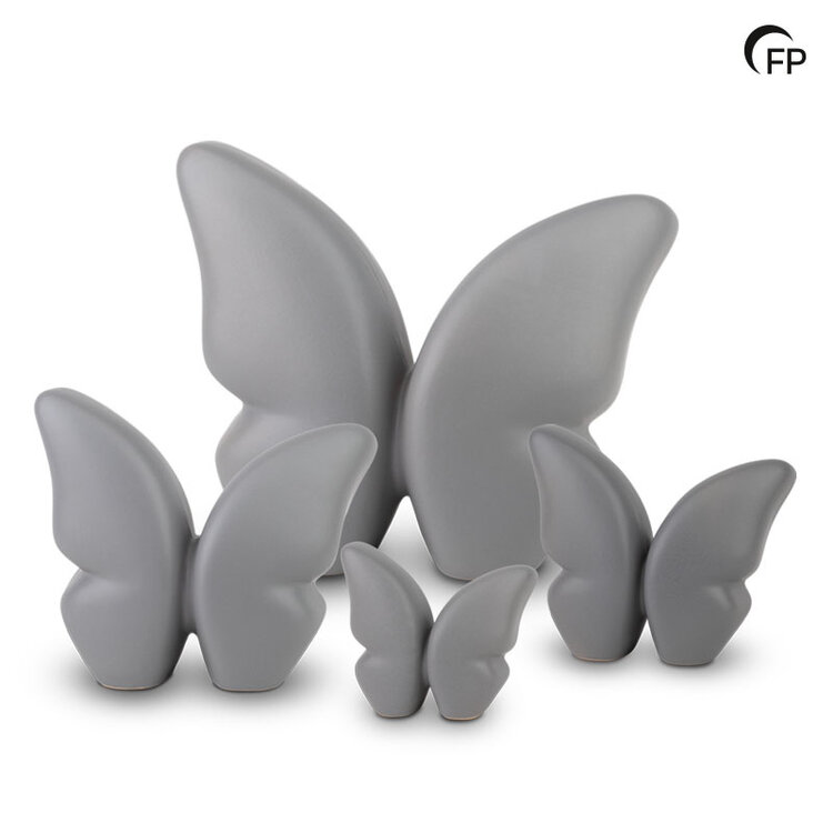 This large ceramic urn in the shape of a butterfly has an elegant matte grey finish that evokes a sense of peace and serenity. The design symbolises the freedom of the soul and cherished memories. The urn is also available in three smaller sizes, including a keepsake version, and in white or black.